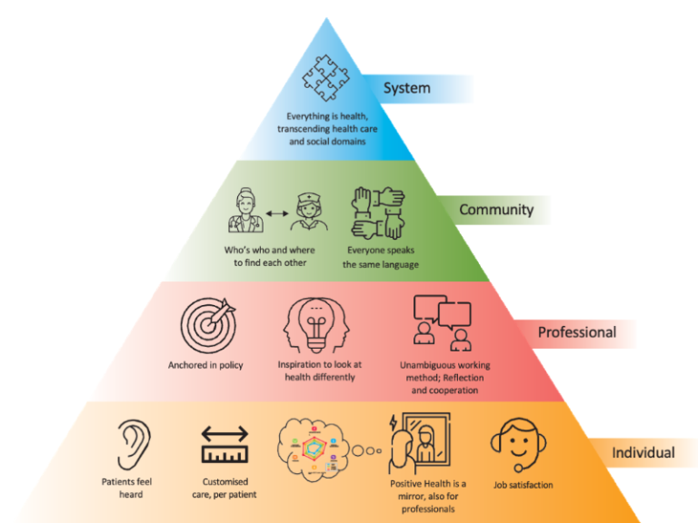 Een cultuurverandering op systeemniveau gericht op gezondheid dat het werken met Positieve Gezondheid op diverse niveaus faciliteert: